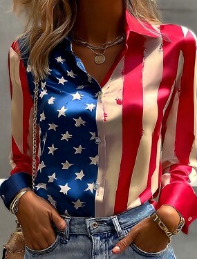 Dia da Independência Americana Mulheres Camisa Social Gráfico Geométrica Bloco de cor Vintage à moda Moderno Manga Longa Colarinho de Camisa Tops regulares Diário Feriado Verde e Azul Vermelho / Azul