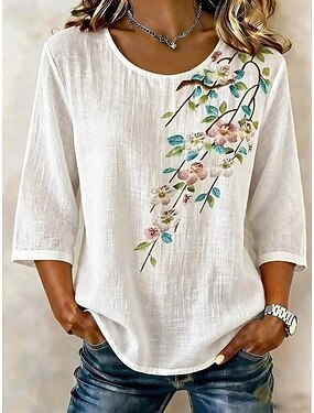 Mulheres Blusa Imprimir Floral Gráfico Plantas Boêmia Tropical à moda Manga 3/4 Meia Manga Gola Redonda Tops regulares Diário Roupas de férias Azul Branco Verde Verão Primavera