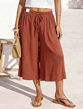 Mulheres Calças Capri Calças de linho de algodão Calças Calças largas Férias Moda Casual Diário Comprimento da panturrilha Cintura Alta Côr Sólida Tecido Com Cordão Bolsos Cintura elástica Conforto
