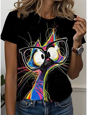 Mulheres Camiseta Imprimir Gráfico Animal Gato Vintage à moda Clássico Manga Curta Gola Redonda Tops regulares Diário Final de semana Preto e Vermelho Preto Rosa / Preto Verão Primavera