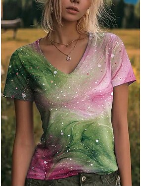 Mulheres Camiseta Imprimir Gráfico Abstrato Vintage à moda Clássico Manga Curta Decote V Tops regulares Casual Diário Para Noite Rosa Verde Verão Primavera