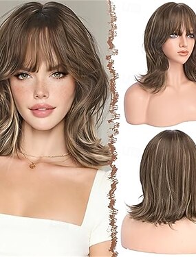 Peruca bob na altura dos ombros com franja para mulheres - peruca sintética ondulada em camadas, com mechas castanhas e loiro mel, ideal para uso diário em festas e fantasias, 35 cm (14 polegadas).