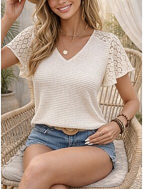 Mulheres Camiseta Waffle Camiseta Blusa Camisetas Renda Patchwork Tecido Ativo Vintage Manga Curta Decote V Tops regulares Diário Feriado Para Noite Damasco Verão Primavera