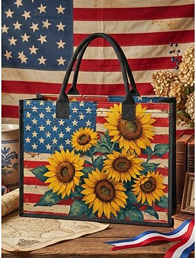 Bolsa feminina de poliéster com grande capacidade e bolso com zíper, estampa patriótica de girassol e bandeira americana, perfeita para o 250º aniversário, Dia da Independência e uso casual diário.