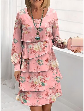 Páscoa Mulheres Vestido no Joelho Vestido casual Vestido de chiffon Vestido de turno Vestido Em Camadas Elegante Férias à moda Normal Floral Manga Longa Gola Redonda Rosa Roxo Fúcsia Verde Verão