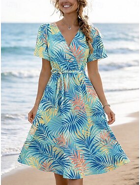 Mulheres Vestido no Joelho Vestido A Line Elegante Férias Casual Encontro Normal Gráfico Folha Manga Curta Decote V Azul Rosa Verde Verão Primavera Outono Inverno