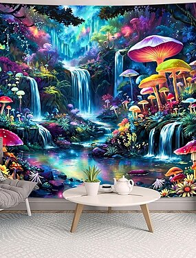 Tapeçaria psicodélica com cogumelos, floresta fantástica e cachoeira para pendurar na parede, paisagem natural mágica e alucinante para quarto, sala de estar, yoga e meditação.