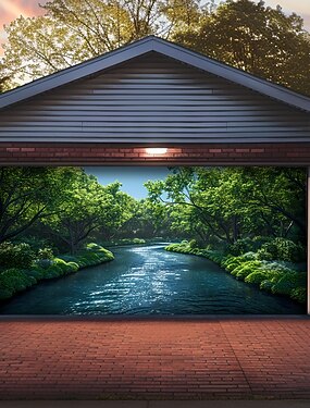 floresta encantada, magia, árvores verdes brilhantes, luz solar, névoa, lagoa, natureza, paisagem, porta de garagem, banner, mural externo, decoração de parede, jardim, exterior de casa, cenário de