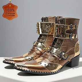 Botas de cano curto masculinas com estampa de cobra vermelha e preta e detalhes metálicos – design moderno e arrojado para festas e comemorações de Natal em clima festivo.