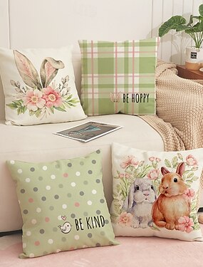 Conjunto de 4 capas de almofada de linho com estampa floral de coelhinho da Páscoa, ideais para decoração de primavera em casa ou no sofá.