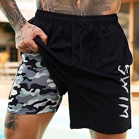 Homens Côr Camuflagem Com letras estampadas Shorts Forrados Shorts de Natação 2 em 1 Shorts de Natação Cintura Média Havaiana Férias Feriado Roupa de Praia Bolsos laterais Com forro de compressão