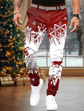 calças estampadas de natal masculinas com cena de natal floco de neve calças casuais com estampa 3d para áreas externas, saídas na rua, poliéster, vinho, preto, azul, s m l, calças elásticas de