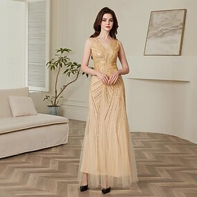 Loucos anos 20 Anos 20 Até o Tornozelo Vestido de Festa Sem Mangas O Grande Gatsby Menina melindrosa Paetês Decote V Fantasia Mulheres Festa de Noite Casamento bar clandestino Adulto Vestido