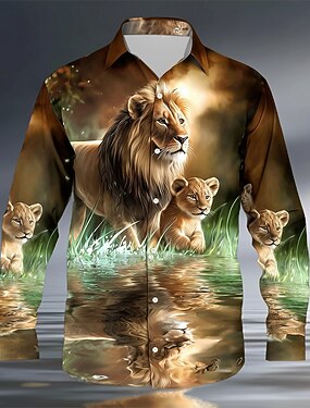 Homens Animal Leão Natureza Camisa Social camisa de botão Manga Longa Vintage retrô Casual Ao ar livre Feriado Primavera Outono Aberto para a Lateral Impressão 3D camisas de colarinho ダークカーキ Marron