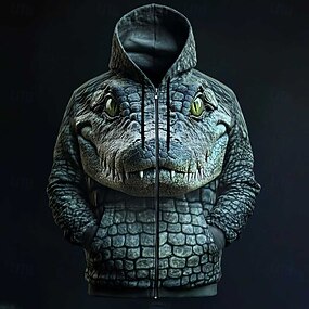 Moletom masculino com zíper, estampa gráfica 3D de crocodilo, animal realista, estilo streetwear, tamanhos P, M, G, GG, XGG e XXGG.