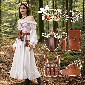 Medieval Renascentista Vestidos Peça para Cabeça Cinto Elfo Fada Fantasia Mulheres Fantasia Dia Das Bruxas Carnaval Espetáculo LARP Ren Faire Adulto Vestido Cinto Mais Acessórios