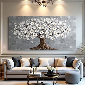 Árvore de flores brancas em 3D, arte em forma de torre sobre tela, pintura com espátula, texturizada, pintada à mão, estilo minimalista, decoração para sala de estar.