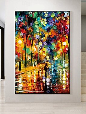 pintura de cenário de rua pintada à mão, faca de espátula artesanal, pintura abstrata de dia e noite de chuva, arte de parede, arte de parede extra grande, tela abstrata texturizada, pintura a óleo,