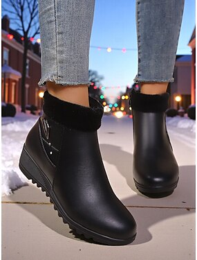 Botas pretas femininas de cano curto com punhos de pele sintética e salto plataforma – estilo chique de inverno, perfeitas para o clima frio, passeios casuais e eventos de fim de ano.