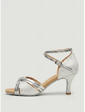 Sapatos de dança de salão femininos prateados – modelo padrão com bico fechado &Sapatos de dança latina com tira cruzada, para prática profissional. &competição