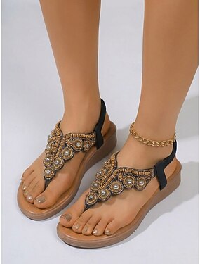 sandálias femininas boêmias com tiras no tornozelo e contas – sapatos baixos de verão com estampa tribal para passeios casuais na praia