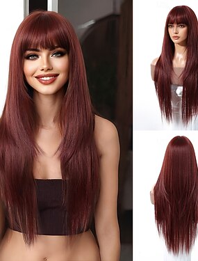 Perucas sintéticas Uniformes Trajes de carreira Princesa Liso Kinky Liso Parte do meio Corte em Camadas Com Franjas Fabrico à Máquina Peruca 22 polegadas Vermelho Vinho Cabelo Sintético Mulheres