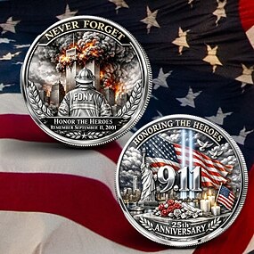 Moeda comemorativa do 11 de setembro dos EUA, em homenagem ao Corpo de Bombeiros de Nova York (FDNY). &heróis, bandeira patriótica &Moeda comemorativa do 25º aniversário do 11 de setembro de 2001, em