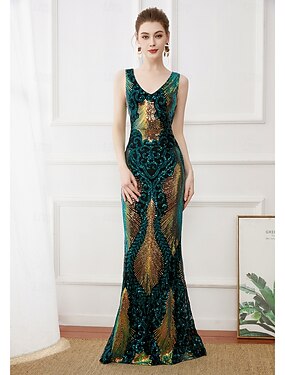Loucos anos 20 Anos 20 Longo Vestidos Vestido de Festa Festa a Fantasia Sem Mangas O Grande Gatsby Lantejoula Tubinho Decote V Fantasia Mulheres Natal Ano Novo Festa de Noite Festa Casamento Adulto