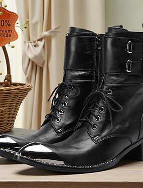 Botas de combate masculinas com cadarço - pretas com detalhes prateados, design arrojado, ideais para uso casual e aventuras ao ar livre.