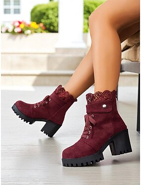 Botas femininas marrons com cadarço, salto grosso e acabamento em crochê, botas vintage de camurça sintética para looks casuais e eventos ao ar livre