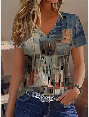 Mulheres Camiseta Imprimir Âmbar Gráfico Geométrica à moda Clássico Casual Manga Curta Decote V Tops regulares Diário Marron Verão Primavera