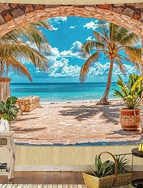 Tapeçaria de janela com paisagem de praia, oceano tropical, palmeiras, cenário de parede à beira-mar, mural de verão para decoração de sala de estar, quarto e escritório.
