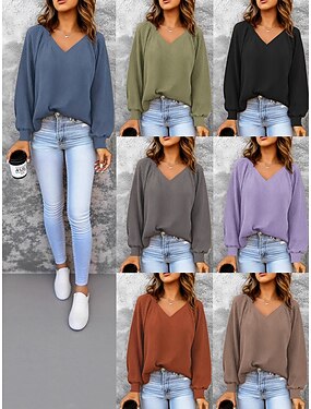 Mulheres Moletom Tecido Casual Manga Longa Decote V Tops regulares Rua Dia a Dia Azul marinho Preto Vinho Roxo Verde Outono Inverno