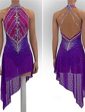 Vestidos para Patinação Artística Mulheres Para Meninas Patinação no Gelo Vestidos Roxo Patchwork Barra Assimétrica Com Transparência Elastano Elasticidade Alta Treino Competição Roupa para Patinação