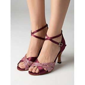 Sapatos de dança latina femininos em cetim bordô, com tiras de strass e bico aberto, ideais para salsa, tango e prática. & desempenho