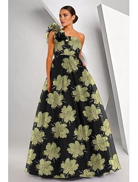 Linha A Longo Vestidos de noite Vestido formal Elegante Diário Vestidos Semi-Formais Manga 3/4 Gola Alta Festa de Jardim Casamento Organza Jacquard com Estampa floral