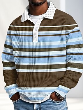 Homens Tiras Horizontais Camisas Polo Waffle Pólo Rúgbi Textura Manga Longa Camisas polo Lapela Roupa de Esporte Casual Escola Roupa Esportiva Roupa Diária Impressão 3D Primavera Outono Inverno Azul