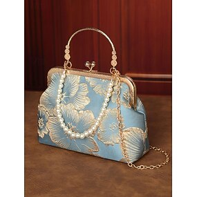 Bolsa clutch feminina elegante com alça de pérolas - design floral bordado com detalhes dourados, opções multicoloridas, perfeita para casamentos, festas e ocasiões formais.
