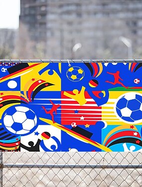 Banner de porta de garagem com o campeonato de futebol de 2026, com jogadores de futebol, bolas de futebol, padrões geométricos coloridos, decoração externa para casa e quintal, mural grande para