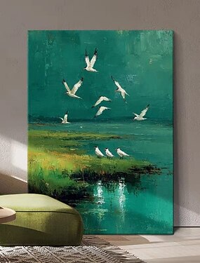 Pintura a óleo artesanal em tela para decoração de parede, representando uma paisagem de uma ilha verde com bandos de gaivotas. Disponível para instalação sem moldura ou com moldura para pendurar.