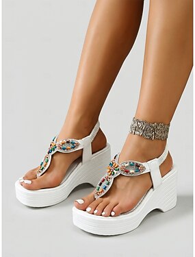 Sandálias femininas de tiras em T com aplicações de joias - sandálias rasteiras elegantes em estilo boêmio com detalhes em pérola, calçado confortável para usar à beira da piscina no verão. &férias em