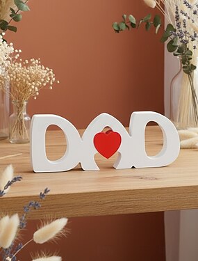 Item decorativo moderno e minimalista em formato de coração branco e vermelho com a palavra "Pai" para o Dia dos Pais. Ideal para decorar mesas e ambientes internos, perfeito para enfeitar a decoração e a decoração da ocasião.