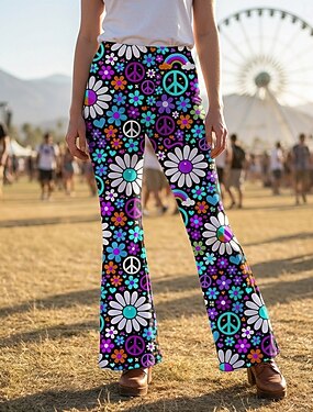 Retro Vintage Boho Anos 70 Calça boca de sino leggings flare Calças boca de sino Discoteca Cintura Alta Floral Fantasia Mulheres Dia Das Bruxas Carnaval Férias Festival de Música Festival Adulto