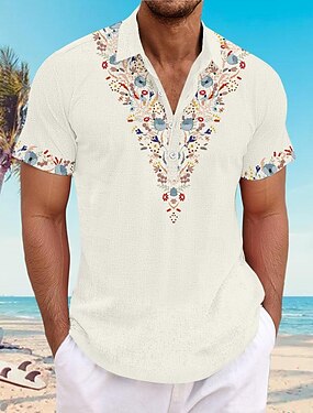 Homens Floral camisa de botão Camisa Henley Manga Curta Havaiana Recorrer Ao ar livre Negócio / Cerimônia / Casamento Casual Verão Primavera Outono Aberto para a Lateral Branco Azul Cáqui