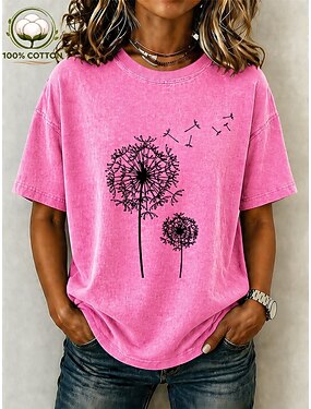 Mulheres 100% Algodão Camiseta Blusas lavadas estilo vintage Imprimir Gráfico Plantas à moda Básico Manga Curta Gola Redonda Tops regulares Casual Diário Azul Preto Rosa Roxo Marron Verão Primavera
