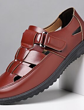 Sandálias masculinas confortáveis em couro sintético marrom, com tira ajustável em velcro, design respirável com recortes, calçado casual para uso diário, ideal para caminhadas e viagens.