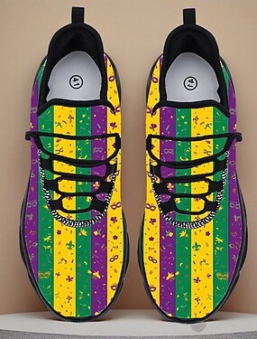 Tênis masculino colorido e festivo – listras de Mardi Gras e designs divertidos, ideais para carnaval, Mardi Gras e festas de rua.