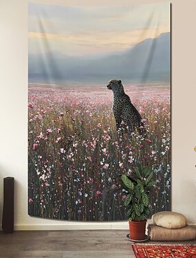 Guepardo em campo de flores silvestres rosa ao pôr do sol na montanha, tapeçaria artística de parede com tema de natureza, estética de safári, animal, decoração para sala de estar, quarto, dormitório