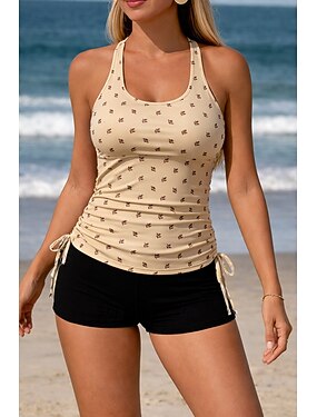Tankini Feminino de 2 Peças Short Controle de Barriga Cintura Alta Slim Costas Descobertas Roupas de Praia de Férias Floral Decote U Sem Mangas