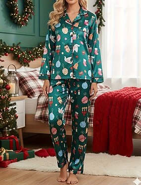 Mulheres Pijamas Loungewear Moda Casual Macia Gráfico Pijama de cetim sedoso Bolsos Cintura elástica Calça Férias Natal Encontro Manga Longa Lapela Verde Outono Inverno Ajuste Largo